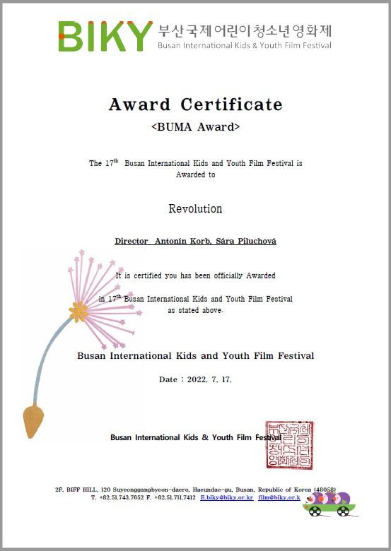 Taktéž se ještě vracíme k loňskému ocenění Antonína Korba, který vyhrál speciální cenu BUMA AWARD za film REVOLUCE na jihokorejském festivalu BIKY v Busanu.