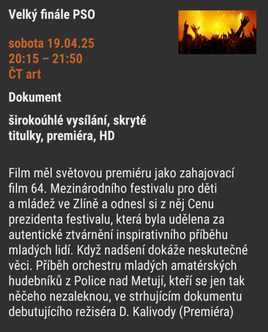 Film Velký finále PSO režiséra, absolventa VOŠ – Akademie Michael zaměření Filmová tvorba, Dominika Kalivody, bude uveden dne 19. 9. 2025 v 20.15 na ČT art – Česká televize. Časosběrný dokument o pozoruhodném hudebním tělese nadšenců z Police nad Metují vznikal 5 let. Je nabitý energií a neutuchajícím entuziasmem protagonistů.
